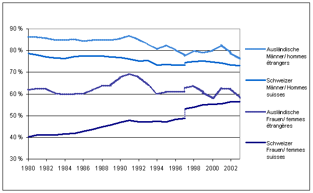 Erwerbsbeteiligung nach Geschlecht und Nationalität, 1980-2003