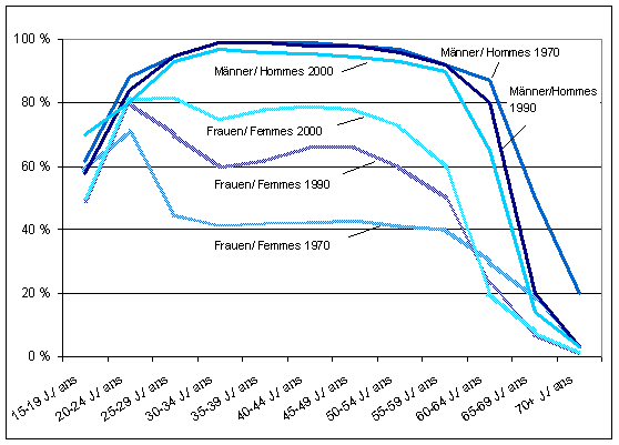Erwerbsbeteiligung nach Geschlecht und Alter, 1970-2000