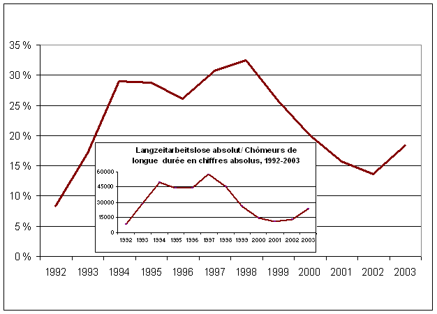 Langzeitarbeitslosigkeit, 1992-2003 (Langzeitarbeitslose in % aller Arbeitslosen) Definitionen/Bemerkungen: Als arbeitslos gemäss seco-Arbeitslosenstatistik gelten nichterwerbstätige Personen, die bei einem kantonalen Arbeitsamt eingeschrieben sind. Die Arbeitslosenquote entspricht den eingeschriebenen Arbeitslosen in Prozent der Erwerbspersonen (Erwerbstätige und Arbeitslose) bei der jeweils neuesten Volkszählung. Als Langzeitarbeitslose gelten Arbeitslose, die mehr als ein Jahr (ununterbrochen) bei einem kantonalen Arbeitsamt als arbeitslos bzw. arbeitslosenversicherungsbezugsberechtigt gemeldet sind. Quelle: Staatssekretariat für Wirtschaft (seco), Arbeitslosenstatistik. Datenaufbereitung: Rolf Nef/Aufdatierung SIDOS Daten ganzer Indikator (html) oder in excel Kurzbeschreibung und Erläuterung vgl. Kapitel im Sozialbericht 2000 und 2004. |