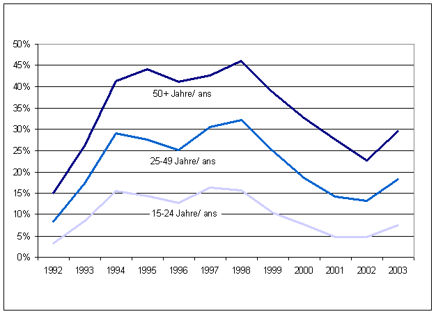 Langzeitarbeitslosigkeit nach Alter, 1992- 2003 (Langzeitarbeitslose in % der Arbeitslosen der jeweiligen Altersgruppe) Definitionen/Bemerkungen: Als arbeitslos gemäss seco-Arbeitslosenstatistik gelten nichterwerbstätige Personen, die bei einem kantonalen Arbeitsamt eingeschrieben sind. Die Arbeitslosenquote entspricht den eingeschriebenen Arbeitslosen in Prozent der Erwerbspersonen (Erwerbstätige und Arbeitslose) bei der jeweils neuesten Volkszählung. Als Langzeitarbeitslose gelten Arbeitslose, die mehr als ein Jahr (ununterbrochen) bei einem kantonalen Arbeitsamt als arbeitslos bzw. arbeitslosenversicherungsbezugsberechtigt gemeldet sind. Quelle: Staatssekretariat für Wirtschaft (seco), Arbeitslosenstatistik. Datenaufbereitung: Rolf Nef/Aufdatierung SIDOS Daten ganzer Indikator (html) oder in excel Kurzbeschreibung und Erläuterung vgl. Kapitel im Sozialbericht 2000 und 2004. |