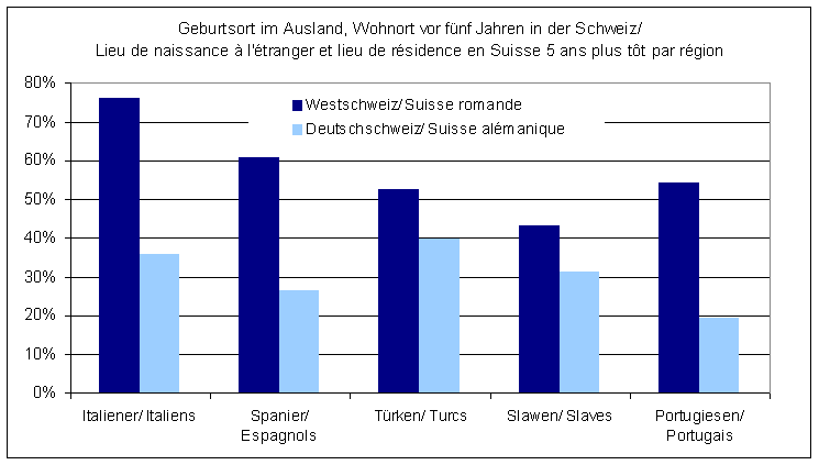 | Anteil der AusländerInnen, die die Schweizer Regionalsprache als «Sprache zu Hause» nennen nach Geburts- und Wohnort, 2000 (in Prozent) |