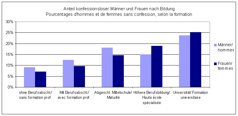 | Konfessionslosigkeit 2000 - Anteil konfessionsloser Männer und Frauen nach Bildung |