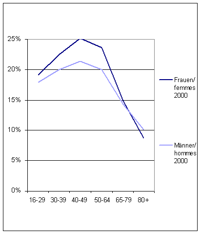 Konfessionslosigkeit 2000 - Anteil Konfessionslose mit tiefer Bildung nach Geschlecht und Alter |