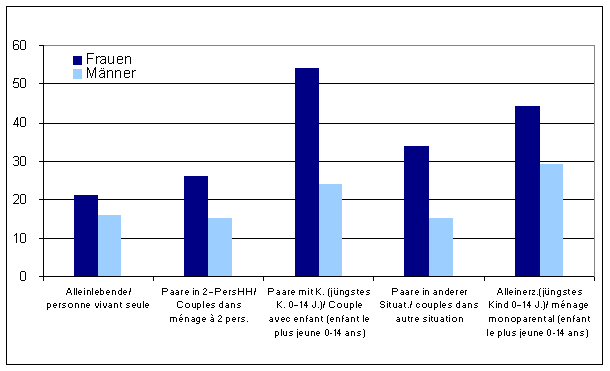Haus- und Familienarbeit (durchschnittlicher Zeitaufwand in Std. pro Woche) 2000 - nach Familiensituation Samplegrösse: 17'748. Quelle: Bundesamt für Statistik, Schweizerische Arbeitskräfteerhebung, 2000 Datenaufbereitung: SIDOS Daten ganzer Indikator (html) oder in excel Kurzbeschreibung und Erläuterung vgl. Kapitel im Sozialbericht 2000 und 2004. |