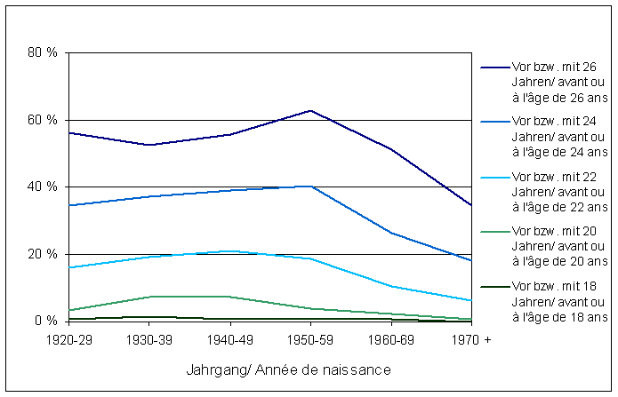 Anteil Personen, die bereits mit dem/der Partner/in zusammenleben oder zusammengelebt haben Definitionen/Bemerkungen: Mit dem/der Partner/in zusammenleben beschreibt den Anteil Personen, die vor oder mit einem bestimmten Alter bereits mit einem/r Partner/in zusammenleben oder zusammengelebt haben. Dies entspricht dem Moment, da zum ersten Mal die Antwortmöglichkeit «mit Partner/in (verheiratet oder nicht)» angegeben wird. Fragestellung: «Mit welchen Person(en) haben Sie im Laufe Ihres Lebens zusammen gewohnt?» Antwortkategorien: Mit Ihrem Vater, mit Ihrer Mutter, mit dem Lebenspartner/in eines Elternteiles, bzw. Stiefvater oder Sitefmutter, mit Geschwister(n) oder Halbgeschwister(n), mit Ehepartner/in, mit Lebenspartner/in, mit eigenen/m Kind(ern), mit adoptierte/m Kind(ern), mit Kind(ern) Ihres Lebenspatners/-partnerin, mit Freund(en) oder Wohnpartner(n), alleine, andere Situation. Samplegrösse: 4'702, gewichtete Daten. Quelle: Schweizer Haushalt-Panel (SHP), Biographische Daten, 2002. Datenaufbereitung: SIDOS Daten ganzer Indikator (html) oder in excel Kurzbeschreibung und Erläuterung vgl. Kapitel im Sozialbericht 2000 und 2004. |