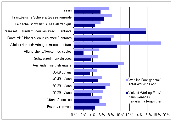 Working-Poor Quoten nach soziodemographischen Gruppen 2002 Definitionen/Bemerkungen: Working Poor sind erwerbstätige Personen, die in einem armen Haushalt leben. Als erwerbstätig gilt eine Person, die: mindestens eine Stunde pro Woche erwerbstätig ist und ein Erwerbseinkommen bezieht, zwischen 20 und 59 Jahre alt ist. Die vom BFS verwendete Armutsgrenze (basierend auf den Richtlinien der Schweizerischen Konferenz für Sozialhilfe) für einen Einpersonenhaushalt liegt 2002 bei Fr. 2200.- und bei Fr. 4300.- für eine Familie mit zwei Kindern. Liegt das Haushaltseinkommen nach Abzug der Sozialversicherungsbeiträge und der Steuern unter der Armutsgrenze so gilt der Haushalt als arm. Vollzeit-Haushalt: Erwerbsarbeit aller Haushaltsmitglieder zusammen beträgt mindestens 36 Wochenstunden. Teilzeit-Haushalt: Erwerbsarbeit aller Haushaltsmitglieder zusammen beträgt weniger als 36 Wochenstunden. Samplegrösse: 1992-2001: 16'000 - 18'000, 2002: 41'263 Quelle: Bundesamt für Statistik, Working Poor in der Schweiz, Ausmass und Risikogruppen auf der Basis der Schweizerischen Arbeitskräfteerhebung 2002 (SAKE), Neuchâtel, 2003. Datenaufbereitung: SIDOS Daten ganzer Indikator (html) oder in excel Kurzbeschreibung und Erläuterung vgl. Kapitel im Sozialbericht 2000 und 2004. |