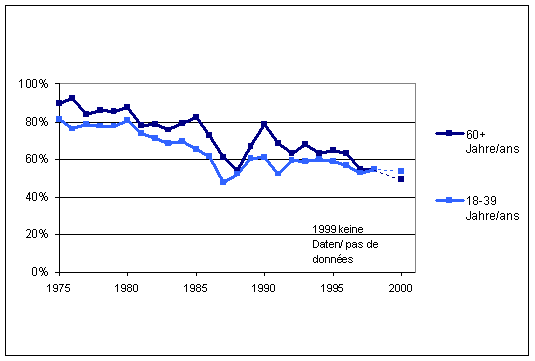 «Wie beurteilen Sie den weiteren Ausbau der Sozial- und Krankenversicherung ?» - Beurteilung nach Alter: «sehr positiv» und «eher positiv» |