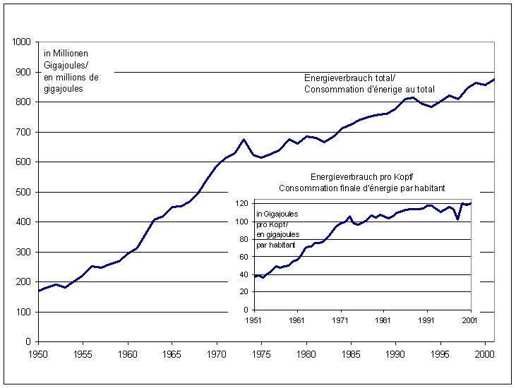 Endverbrauch von Energie total und pro Kopf 1950 - 2001 Quelle Bundesamt für Statistik, Schweizerische Gesamtenergiestatistik. Datenaufbereitung: Rolf Nef/Aufdatierung SIDOS Daten ganzer Indikator (html) oder in excel Kurzbeschreibung und Erläuterung vgl. Kapitel im Sozialbericht 2000 und 2004. |
