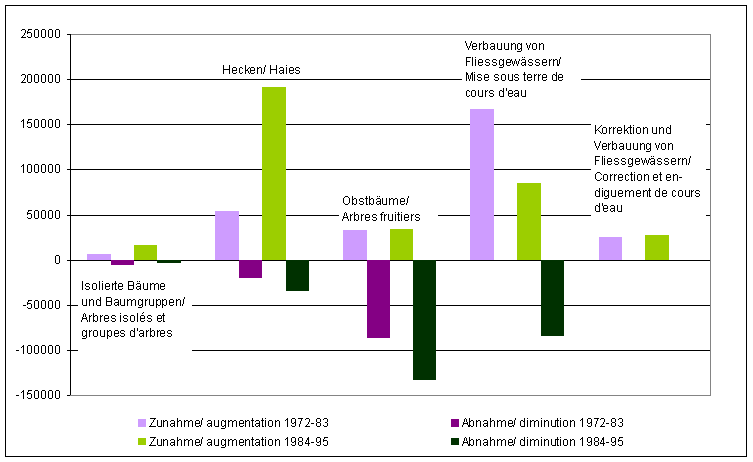 Veränderungen bei einigen Strukturelementen der Landschaft zwischen 1972 und 1995 Definitionen/Bemerkungen: Angaben für Bäume und Baumgruppen: Anzahl; Angaben für Hecken, Verbauung, Korrektion und Eindämmung von Fliessgewässern, Böschungen und Dämmen: in Metern. Quelle: Bundesamt für Raumentwicklung/Bundesamt für Umwelt, Wald und Landschaft (BUWAL), Landschaft unter Druck, Bern 1991 und 2001. Datenaufbereitung: SIDOS Daten ganzer Indikator (html) oder in excel Kurzbeschreibung und Erläuterung vgl. Kapitel im Sozialbericht 2000 und 2004. |