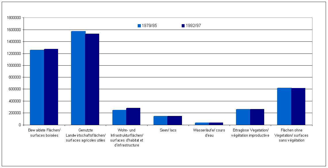 Bodennutzung (in ha) 1979/85-1992/97 Quelle: Bundesamt für Umwelt, Wald und Landschaft (BUWAL), «Landschaft unter Druck», Bern. Datenaufbereitung: SIDOS Daten ganzer Indikator (html) oder in excel Kurzbeschreibung und Erläuterung vgl. Kapitel im Sozialbericht 2000 und 2004. |