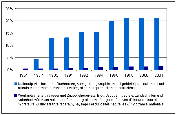 Nationale Schutzgebiete (Anteil in % der Landesfläche) 1961-2001 Definitionen/Bemerkungen: In der Grafik ausgewiesen sind die offiziellen Schutzgebiete innerhalb der Landesgrenzen. Mehrfach geschützte Zonen wurden nur einmal aufgenommen. Quelle: Bundesamt für Statistik, Bereich Nachhaltige Entwicklung und regionale Disparitäten. Datenaufbereitung: SIDOS Daten ganzer Indikator (html) oder in excel Kurzbeschreibung und Erläuterung vgl. Kapitel im Sozialbericht 2000 und 2004. |