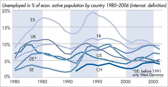 Unemployed in % of econ. active population by country 1980–2006 (internat. definition)
