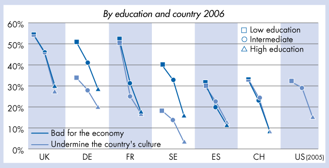 ‘Immigrants are bad for the economy’ and ‘Immigrants undermine the country's culture’ - By education and country 2006