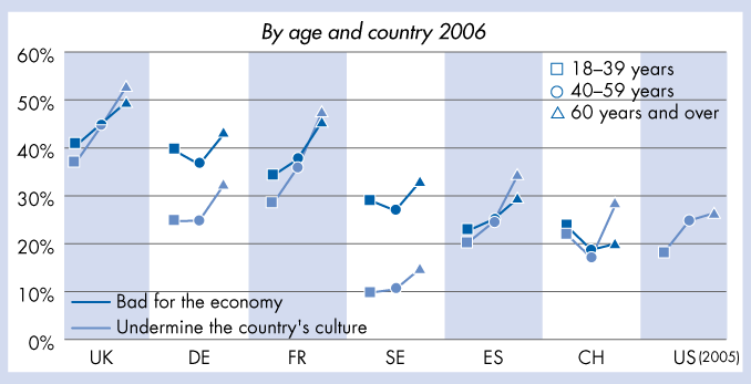 ‘Immigrants are bad for the economy’ and ‘Immigrants undermine the country's culture’ - By age and country 2006