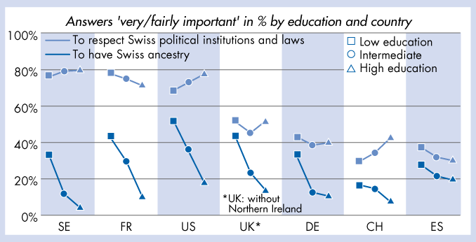 | ‘What is important for being truly Swiss?*’ 2003 (*German, Armerican, English, Spanish, French, Swedish) - Answers ‘very/fairly important’ in % by education and country |