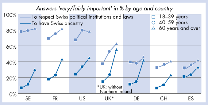 ‘What is important for being truly Swiss?’ 2003 (*German, Armerican, English, Spanish, French, Swedish) - Answers ‘very/fairly important’ in % by age and country |