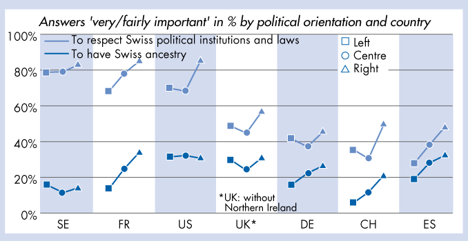 ‘What is important for being truly Swiss?’ 2003 (*German, Armerican, English, Spanish, French, Swedish) - Answers ‘very/fairly important’ in % by political orientation and country |