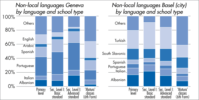 Native language of pupils 2005/2006 - Non-local languages Geneva and Basel (city) by language and school type