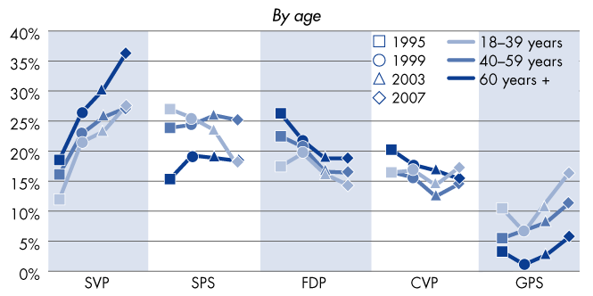 Electorate of the parties 1995–2007, by age