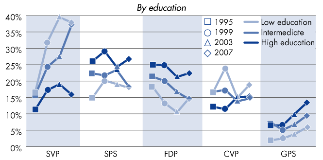 Electorate of the parties 1995–2007, by education
