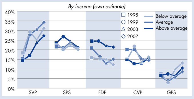 Electorate of the parties 1995–2007, by income (own estimate)