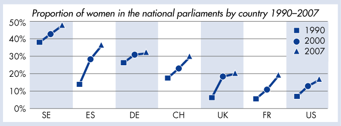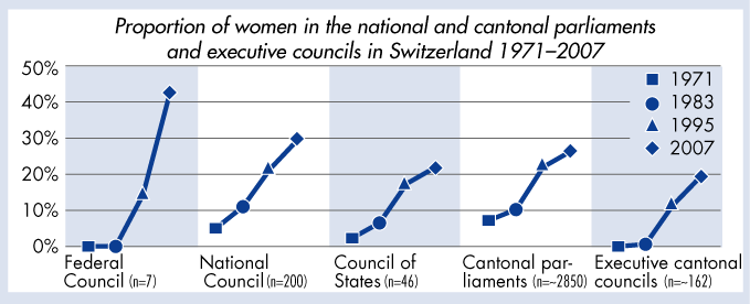 Proportion of women in the national and cantonal parliaments and executive councils in Switzerland 1971–2007