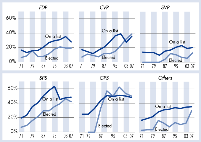Proportion of women on voting lists and elected by party in Switzerland 1971–2007