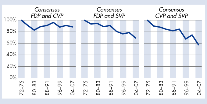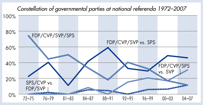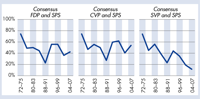 | Consensus between the governmental parties on national referenda in the parliamentary terms 1972–2007 - Consensus FDP and SPS, CVP and SPS, SVP and SPS |