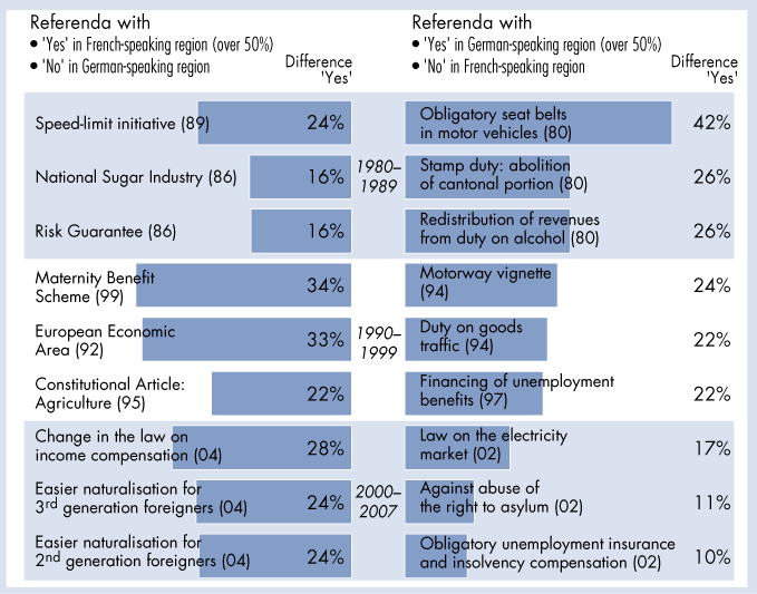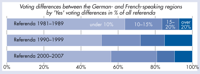 | Divergent voting behaviour at national referenda - Voting differences between the German- and French-speaking regions by 'Yes' voting differences, in % of all referenda |