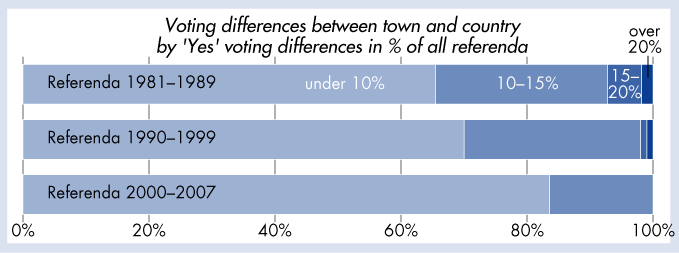 Divergent voting behaviour at national referenda - Voting differences between town and country by 'Yes' voting differences, in % of all referenda |