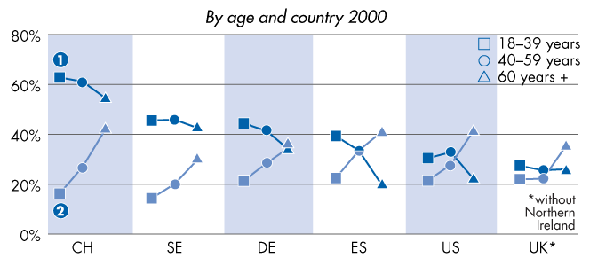 | Ecological awareness: Agreement with statement in %, by age and country 2000 |