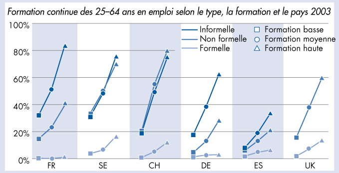 | Formation continue des 25–64 ans en emploi selon le type, la formation et le pays 2003 |