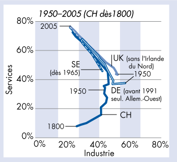| Employés dans l'industrie et les services en % par pays - 1950–2005 (CH dès 1800) |