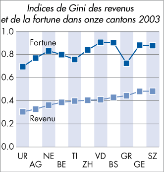 Indices de Gini des revenus et de la fortune dans onze cantons 2003 |