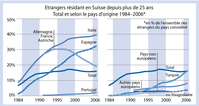 Etrangers résidant en Suisse depuis plus de 25 ans – Total et selon le pays d'origine 1984–2006