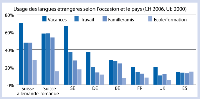 | Usage des langues étrangères selon l'occasion et le pays (CH 2006, UE 2000) |