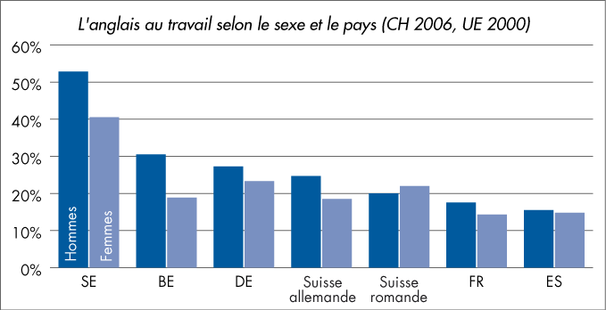 L'anglais au travail selon le sexe et le pays (CH 2006, UE 2000)