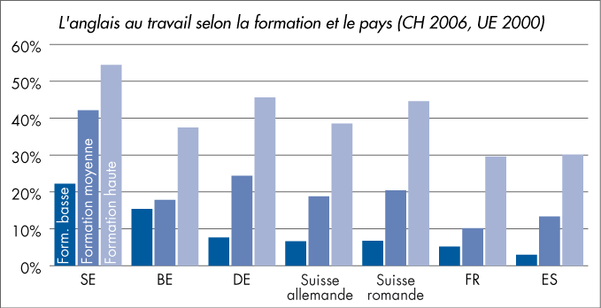 L'anglais au travail selon la formation et le pays (CH 2006, UE 2000)