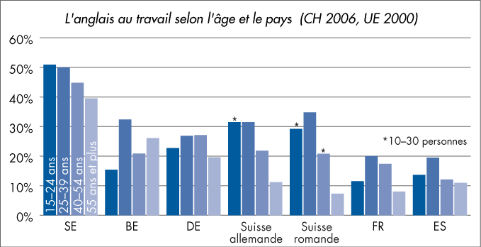 L'anglais au travail selon l'âge et le pays (CH 2006, UE 2000)