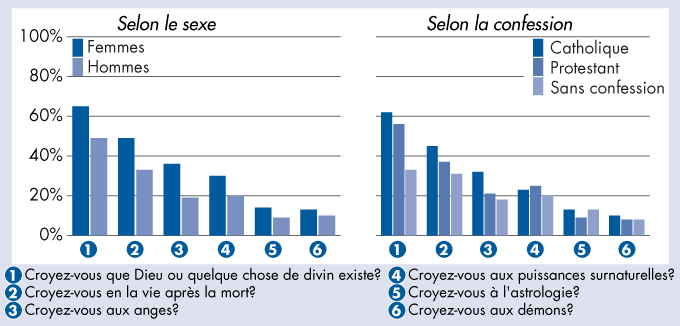 Croyances religieuses 2007: réponses «très» et «assez» en pourcent – Selon le sexe et la confession