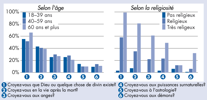 Croyances religieuses 2007: réponses «très» et «assez» en pourcent – Selon l'âge et la religiosité