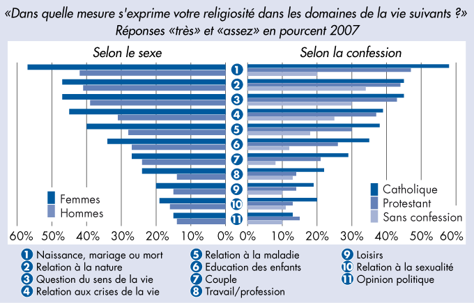 Dans quelle mesure s'exprime votre religiosité dans les domaines de la vie suivants ? Réponses «très» et «assez» en pourcent 2007 - Selon le sexe et la confession