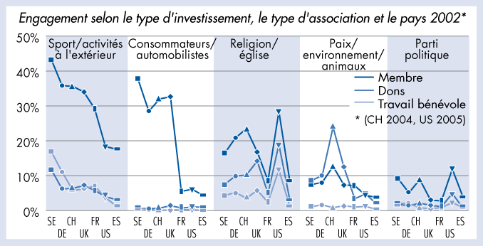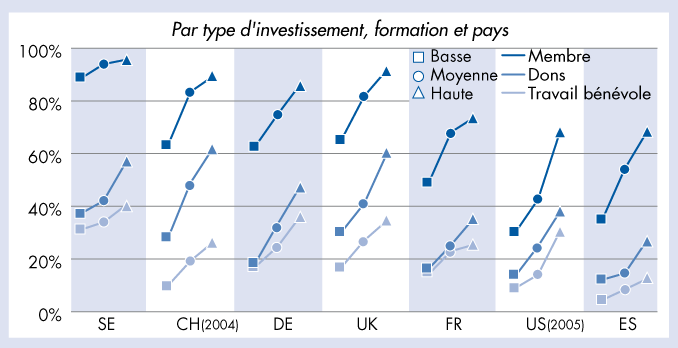 Engagement selon le type d'investissement, le type d'association et le pays 2002 (CH 2004, US 2005)