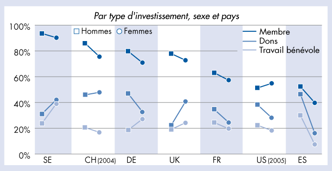 Engagement dans au moins une association 2002 - Par type d'investissement, sexe et pays
