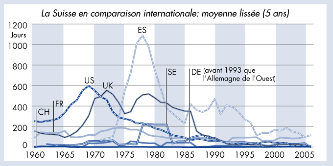 Jours de grève pour 1000 travailleurs 1960–2006 - La Suisse en comparaison internationale: moyenne lissée (5 ans)
