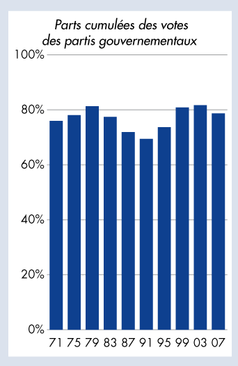 Les partis en Suisse: élections au Conseil national 1971–2007 - Parts cumulées des votes des partis gouvernementaux |