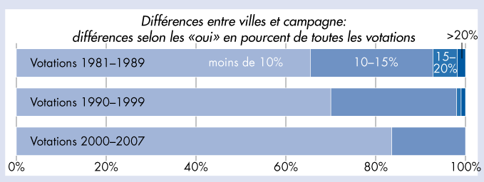 Divergences du comportement électoral lors des votations fédérales - Différences entre villes et campagne: différences selon les « oui », en pourcent de toutes les votations |