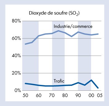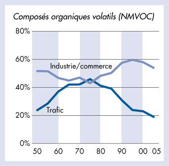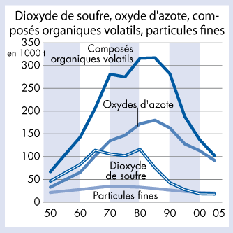 | Emmissions polluantes dans l'air en 1000 tonnes 1950–2005: Dioxyde de soufre, oxyde d'azote, composés organiques volatils, particules fines |