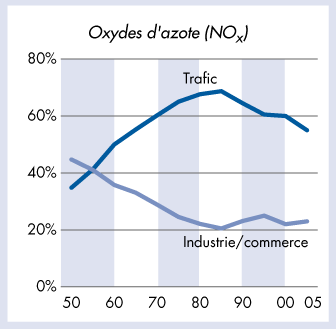 Principaux émetteurs de quatre polluants de l'air 1950–2005 en pourcentage: Oxydes d'azote (NOx) |