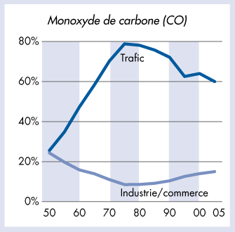 Principaux émetteurs de quatre polluants de l'air 1950–2005 en pourcentage: Monoxyde de carbone (CO) |